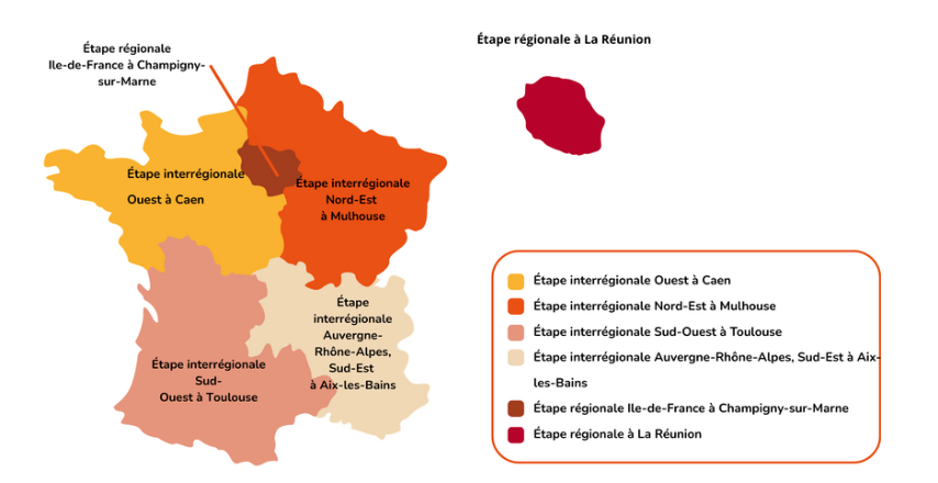 Dans un premier temps ont lieu des sélections régionales qui conduiront chacune des équipes retenues à prendre part à la finale nationale (qui se déroulera en Janvier 2027). Ces étapes régionales se tiendront dans 6 grandes villes de France et à la Réunion :